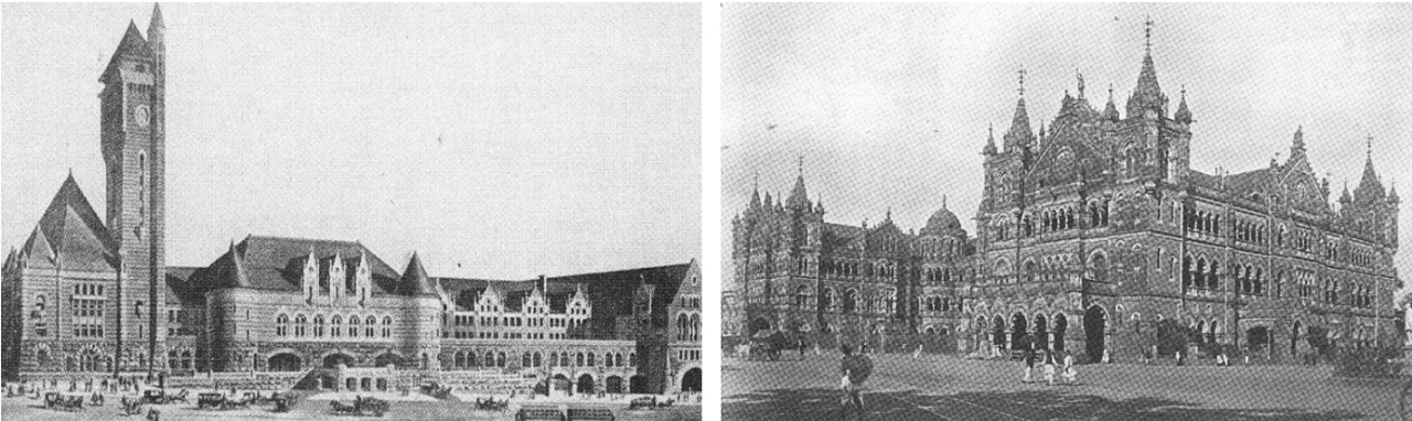 從左向右、從上向下依次為:圣路易斯聯(lián)合車站一側(cè)單鐘塔、英國國王十字車站單鐘塔居中、印度孟買維多利亞總站對(duì)稱雙鐘塔、法蘭克福中央車站弱化鐘塔